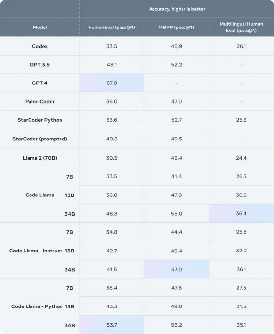 Pour tester les performances de Code Llama par rapport aux solutions existantes, Meta a utilisé deux benchmarks populaires de programmation : HumanEval et Mostly Basic Python Programming (MBPP). HumanEval évalue la capacité du modèle à compléter du code en se basant sur des docstrings, tandis que MBPP évalue la capacité du modèle à écrire du code en se basant sur une description.[caption id="attachment_51851" align="aligncenter" width="557"]
