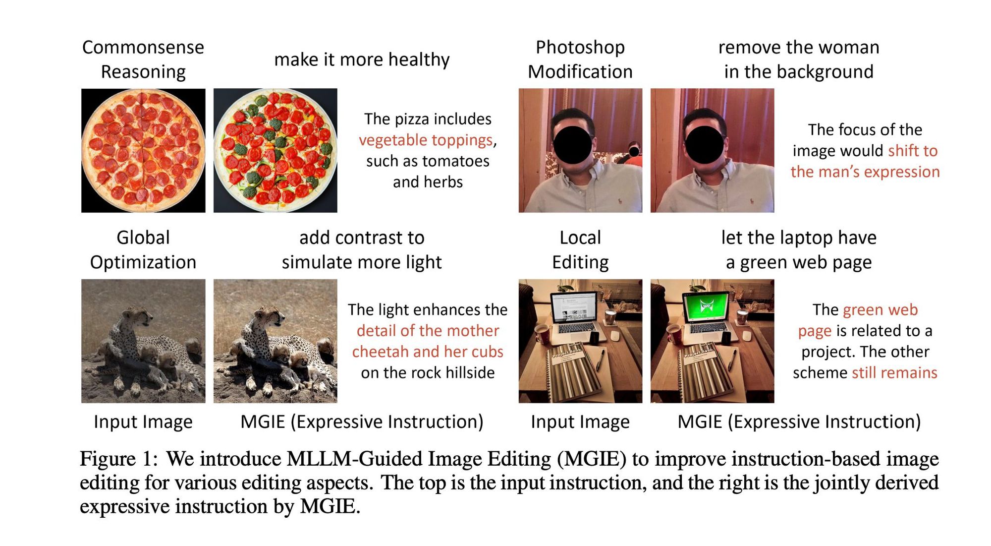 Vue d'ensemble de l'Édition d'Image Guidée par MLLM (MGIE), qui exploite les MLLMs pour améliorer la modification d'image basée sur les instructions. MGIE apprend à dériver des instructions expressives concises et fournit un guidage explicite lié à la visualisation pour l'objectif visé. Le modèle de diffusion est entraîné conjointement et réalise la modification d'image avec l'imagination latente à travers la tête de modification de manière bout à bout. et montre que le module est entraînable et figé, respectivement.[/caption]