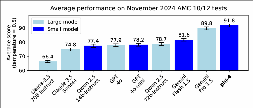 Phi-4 a obtenu des résultats impressionnants, surpassant des modèles plus grands comme Gemini Pro 1.5, Claude 3.5 Sonnet et GPT-4o, comme on peut le constater dans ce graphique.
