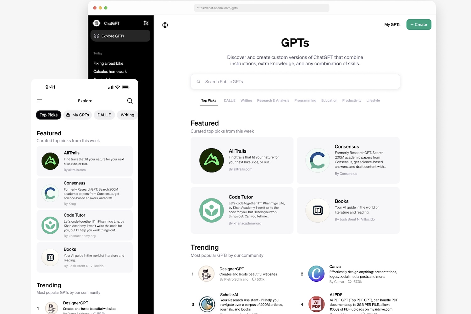 Les GPT sont pour l'instant répartis en 7 catégories dans le "magasin" : DALL-E, rédaction, productivité, recherche et analyse, programmation, éducation et mode de vie. OpenAI prévoit de mettre de nouveaux GPT en avant chaque semaine, ceux qui seront considérés comme les plus "utiles" et les plus "percutants".La société présente quelques-uns des GPT mis en vedette : des recommandations personnalisées de sentiers d'AllTrails, la synthèse d'articles académiques avec Consensus, des tutoriels de programmation de Khan Academy, la conception de présentations avec Canva.