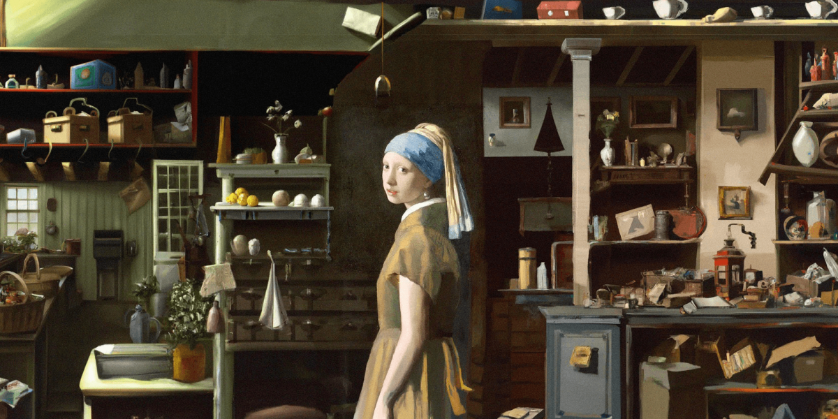 Pour illustrer la présentation d'Outpainting, Open AI a choisi une version revisitée avec Outpainting du célèbre tableau « La Jeune Fille à la perle » de Johannes Vermeer. Cette peinture à l'huile de dimension moyenne est un portrait en buste d'une jeune femme anonyme sur fond très sombre.August Kamp est parti de cette huile, a ajouté un corps à la jeune fille, puis créé un décor de cuisine rustique très encombrée en ajoutant des cadres. On doit bien reconnaître que le résultat est cohérent et plutôt réussi. De nombreux autres utilisateurs se sont emparés d'Outpainting, certains résultats sont eux-aussi très réussis, d'autres beaucoup moins...