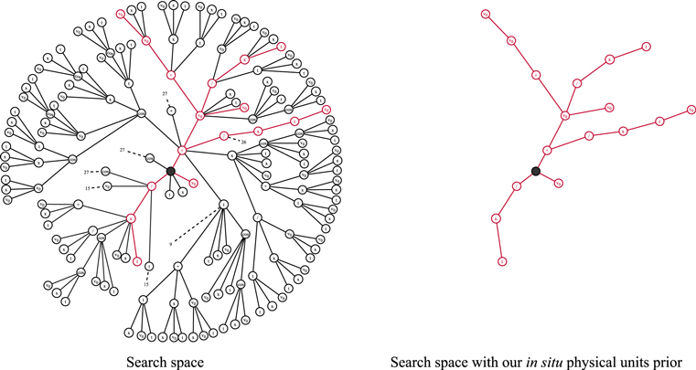 Ce cadre a été conçu dès le départ pour incorporer et tirer pleinement parti des informations sur les unités physiques pendant la RS en stockant et en gérant les informations liées à l’analyse dimensionnelle. PhySO inclut les contraintes unitaires in situ pendant le processus de génération d’équations, de sorte que seules les équations à unités équilibrées sont proposées par construction, réduisant ainsi considérablement l’espace de recherche comme illustré dans la figure ci-dessous.