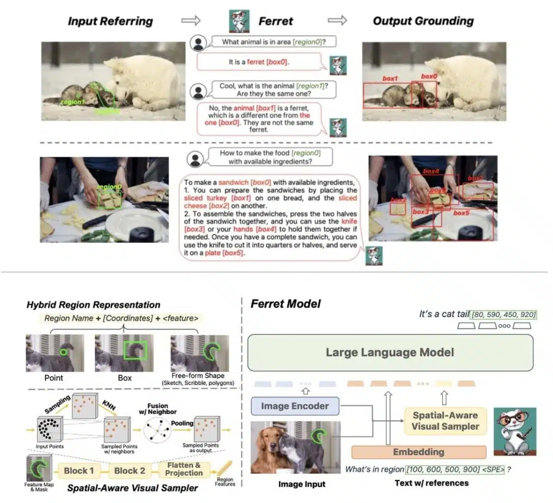 Comme représenté dans la figure ci-dessus, Ferret se compose d'un encodeur d'image pour extraire des embeddings d'image, d'un échantillonneur visuel conscient de l'espace proposé pour extraire des caractéristiques continues régionales, et d'un MLLM pour modéliser conjointement les caractéristiques de l'image, du texte et de la région.