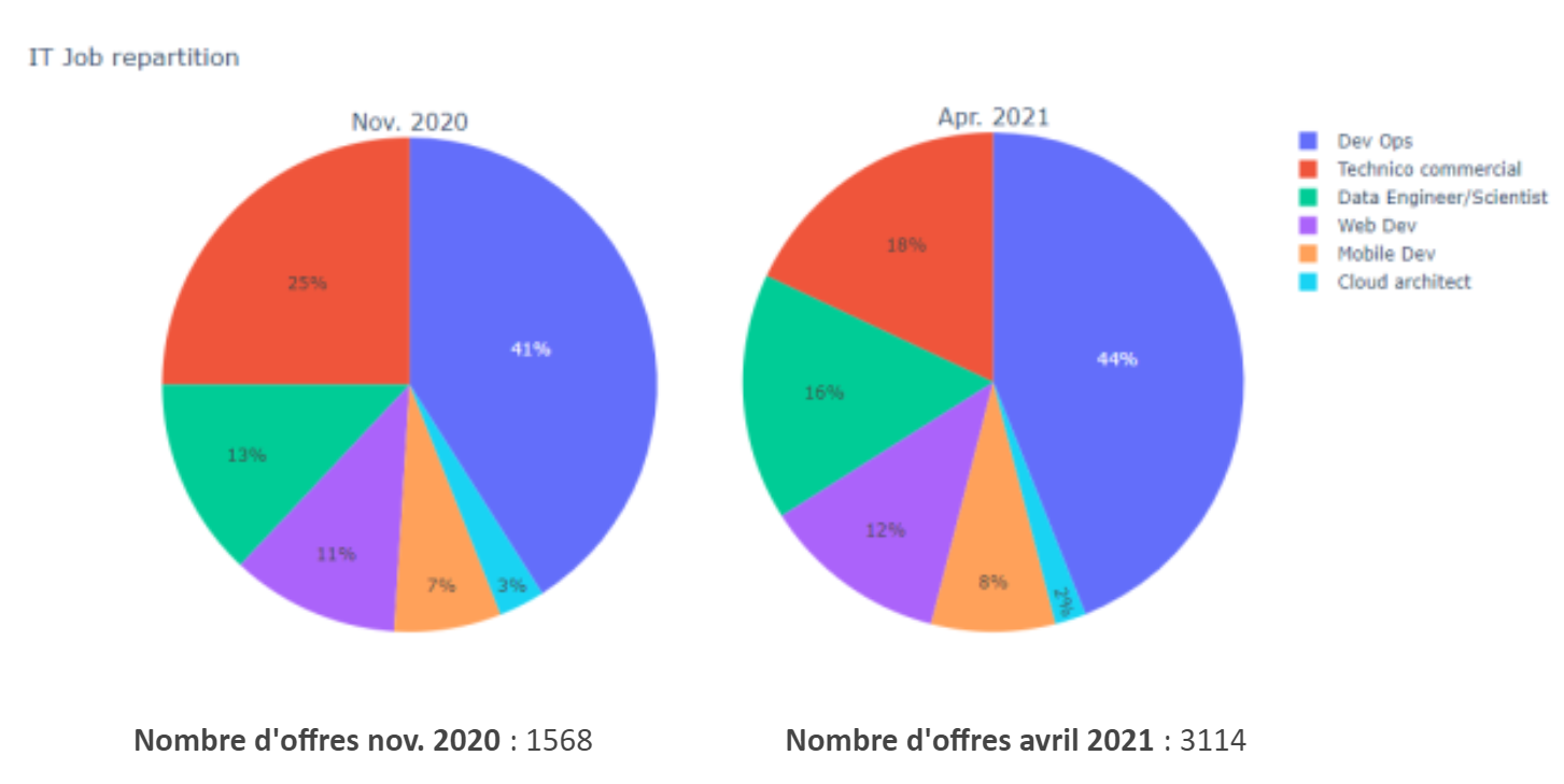 Afin de réaliser le premier graphique, les équipes de Neobrain ont observé l'évolution de la répartition des métiers IT entre novembre 2020 et avril 2021. Voici les résultats qui se sont dégagés :