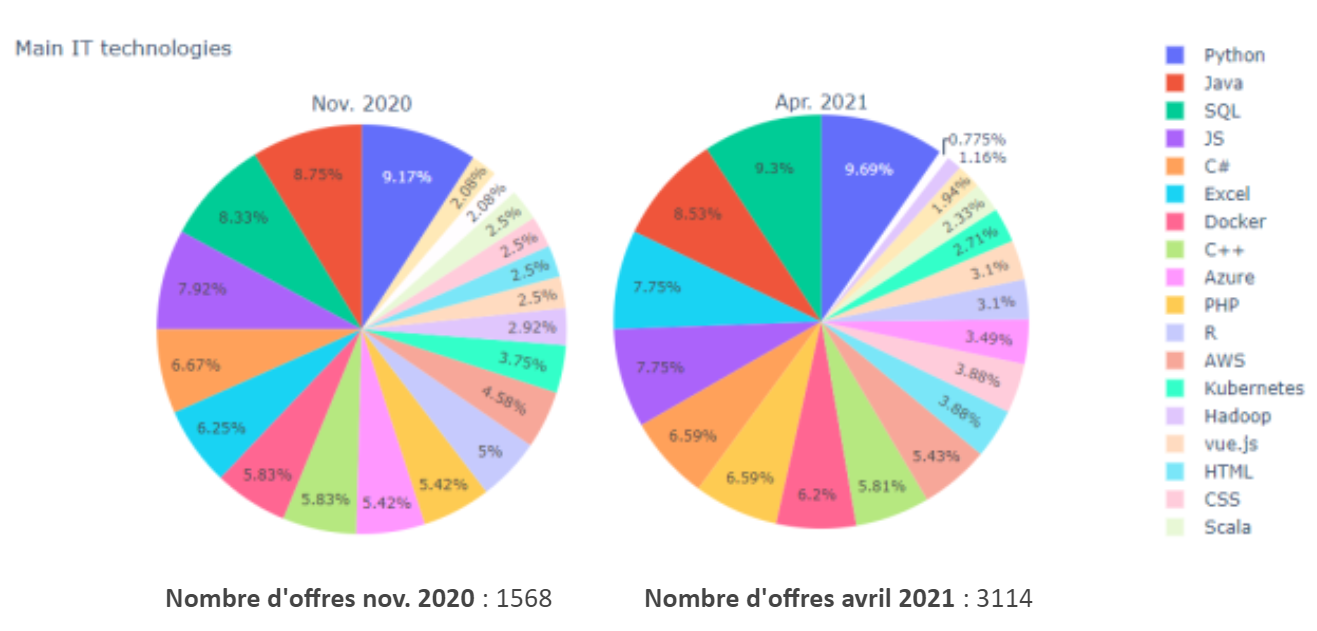 - Les métiers de la Data (Data Scientists / Data Engineer) : en novembre 2020, 13 % des postes concernaient la data contre 16 % en avril 2021.