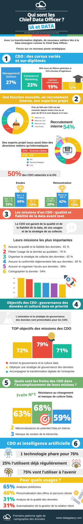 Avec la transformation digitale, les entreprises ont dû s'adapter et trouver de nouvelles ressources pour gérer un Big Data toujours plus important mais crucial pour leurs activités. De nouveaux métiers émergent comme le Chief Data Officer. Encore peu nombreux, DataGalaxy, 1èreplateforme agile de cartographie des données a réalisé une enquête auprès d'eux. Qui sont ces CDO, leurs cursus, leurs missions, les freins à leur développement... Que pensent-ils de l'arrivée de l'Intelligence artificielle dans leur travail ? (voir l'infographie en fin d'article)