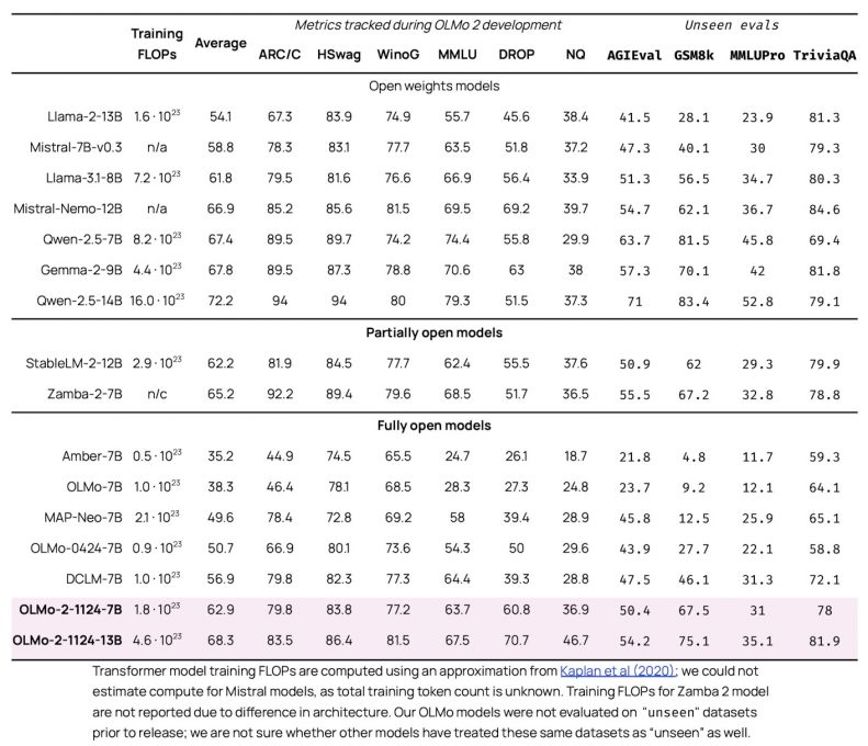 Selon les évaluations d'AI2, OLMo 2 7B et 13B sont les meilleurs modèles entièrement ouverts à ce jour, surpassant souvent les modèles de "poids ouverts" de taille équivalente, tout en égalant voire dépassant certains modèles partiellement propriétaires. Par exemple, OLMo-2-7B surpasse Llama 3.1 8B de Meta tandis qu’OLMo-2-13B dépasse Qwen 2.5 7B d'Alibaba Cloud malgré un coût de calcul moindre.