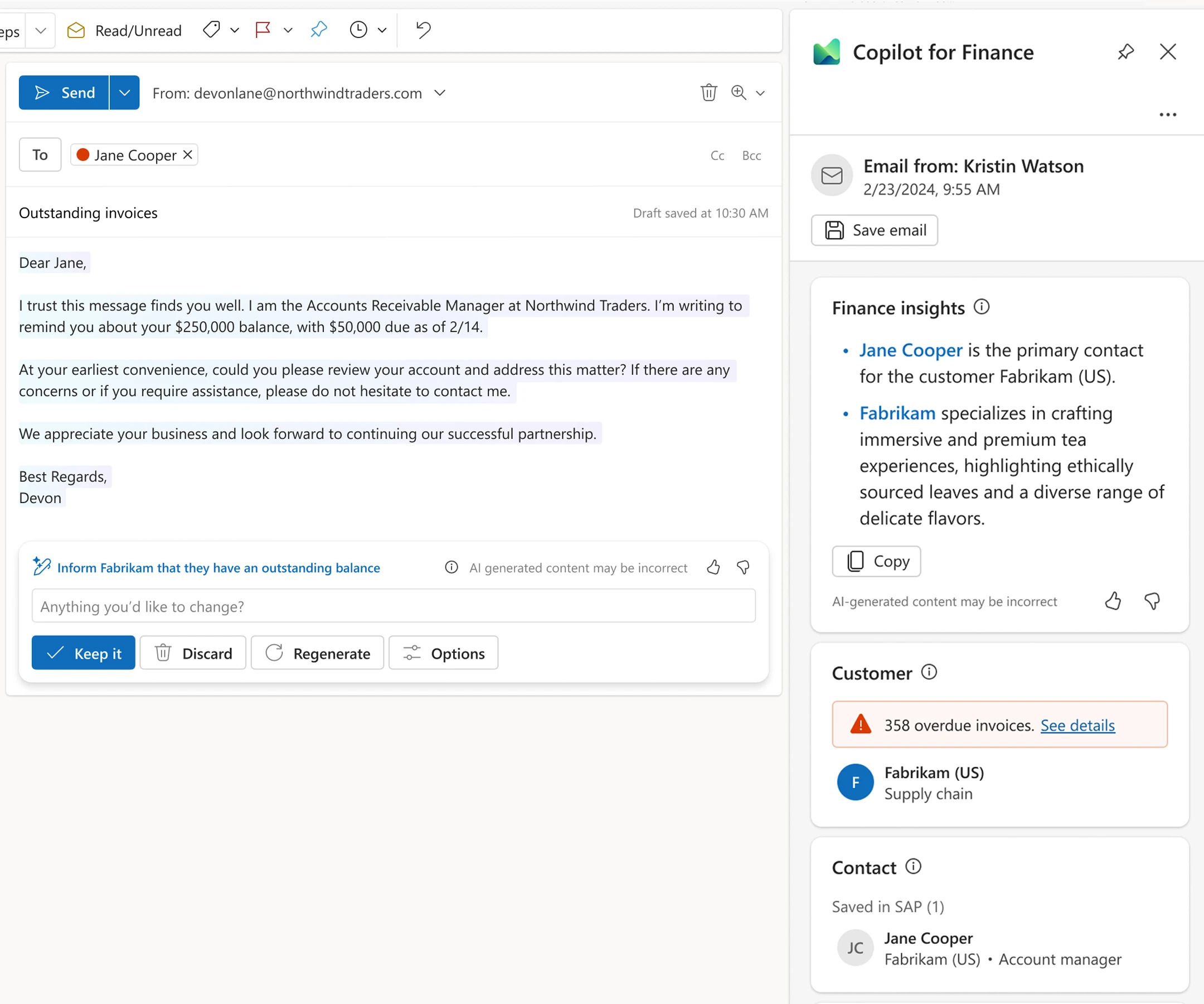 Microsoft donne l'exemple des audits des états financiers d’une entreprise, essentiels pour assurer l’exactitude et atténuer les risques. Alors que les gestionnaires des comptes clients doivent extraire manuellement les données des comptes des enregistrements ERP, les rapprocher dans Excel et rechercher manuellement les inexactitudes, une seule invite permet aux responsables des comptes débiteurs d’agir sur les incohérences et les défauts de paiement détectés à l’aide de la copie suggérée par Copilot for Finance et des factures pertinentes.