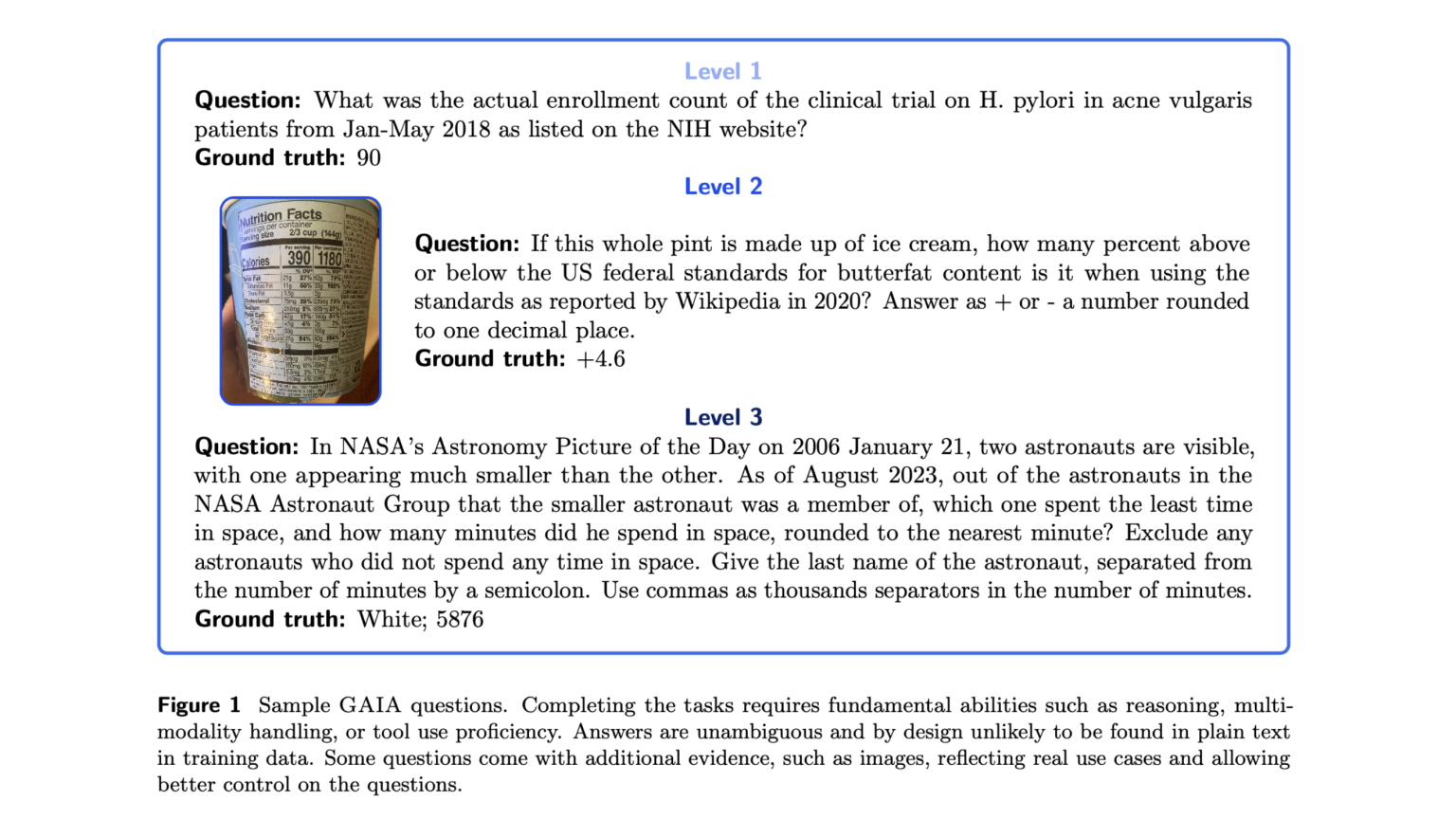 GAIA est un ensemble de 466 questions élaborées et annotées par des humains, "conceptuellement simples mais exigeantes pour les LLMs", rédigées sous forme de texte et pouvant parfois être accompagnées de fichiers supplémentaires, tels que des images ou des feuilles de calcul.Elles abordent divers scénarios d'utilisation des assistants d'IA, couvrant des aspects tels que les tâches quotidiennes personnelles, les domaines scientifiques ou les connaissances générales. La formulation des questions vise à admettre une réponse unique et factuelle, permettant une évaluation automatique simple et robuste.