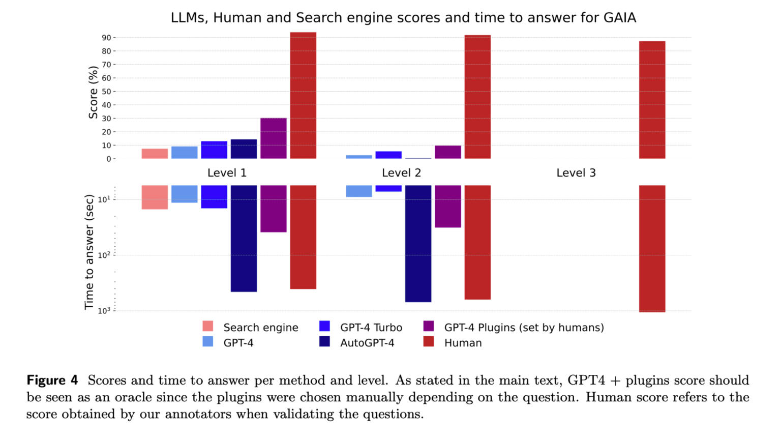 L'équipe a saisi les questions dans un moteur de recherche ce qui lui a d'ailleurs permis d'évaluer s'il était facile ou non de trouver la réponse sur le web.Les chercheurs ont comparé les scores et les temps de réponse du moteur de recherche, de GPT-4 avec ou sans l'ajout de plugins, GPT-4 turbo et AutoGPT-4 au score obtenu par les annotateurs lors de la validation des questions. Alors que ce dernier était de 92 %, GPT-4 avec des plugins n’a obtenu qu’un score de 15 %.