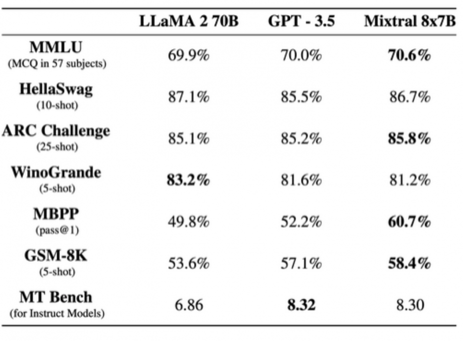Son premier modèle Mistral 7B avait donc été mis à la disposition des développeurs. Bien que de petite taille, ce LLM surpassait tous les modèles ouverts allant jusqu’à 13B paramètres alors disponibles sur tous les benchmarks standards en anglais et en code.La société annonce à présent le lancement du modèle Mixtral 8x7B, basé sur une architecture à mélange clairsemé d'experts (SMoE) avec des poids ouverts, le tout sous licence Apache 2.0.