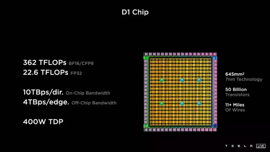 Lors du Tesla AI Day qui s'est déroulé le 19 aout 2021, la puce Tesla Dojo D1 a été dévoilée. Présentée par l'entreprise comme possédant "la puissance de calcul d'un GPU avec la flexibilité d'un CPU", elle sera dédiée à l'entrainement IA. La puce a été entièrement développée en interne et repose sur une plate-forme ASIC avec 50 milliards de transistors reposant sur un die de 645 mm2, le tout gravé chez TSMC en 7 nm.La puce centralisera et traitera toutes les informations fournies par le réseau de caméras et de semiconducteurs pour optimiser le fonctionnement de l’Autopilot et arriver à une véritable conduite 100 % autonome, tel est l'objectif de la marque. Selon Tesla, la puce D1 développe une bande passante doublée par rapport aux puces actuellement utilisées dans les réseaux.