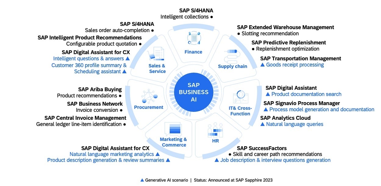 La figure ci-dessous montre les fonctionnalités d'IA annoncées par SAP, y compris celles qui apportent de la valeur à plusieurs fonctions métier, telles que les scénarios d’IA générative dans SAP Analytics Cloud et SAP Signavio Process Manager.