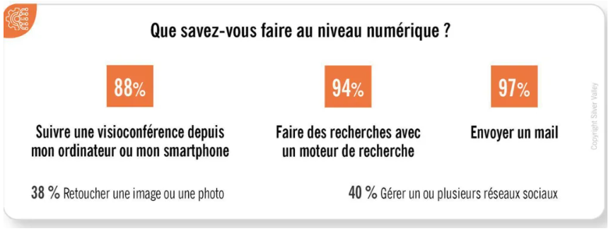 D'autres questions ont été posées aux séniors. Un focus a été réalisé sur leurs compétences numériques : pratiquement la totalité des personnes questionnées a affirmé avoir les capacités d'envoyer un mail ou faire des recherches sur internet à l'aide d'un moteur de recherche. Un peu moins de 9 personnes sur 10 savent suivre une visioconférence depuis leur smartphone ou leur ordinateur. Par contre, moins de la moitié des séniors savent gérer les réseaux sociaux ou retoucher une image ou une photo.