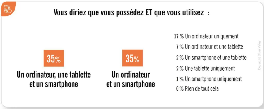 Plus de deux tiers des personnes de plus de 60 ans possèdent au moins un ordinateur et un smartphone. Aucun des séniors sondés n'a affirmé posséder aucun équipement numérique. La tablette semble un peu moins démocratisée que le téléphone ou l'ordinateur.