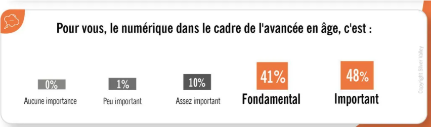 Les personnes de plus de 60 ans ont été soumises à la question suivante : "Ressentez-vous des lacunes dans l'usage du numérique, aimeriez-vous savoir faire plus de choses ?". 3 séniors sur 4 ont affirmé posséder des lacunes dans le domaine tout en évoquant le souhait d'être mieux initiées aux équipements numériques. De plus, presque 9 personnes sur 10 considèrent que savoir utiliser les outils du numérique est quelque chose de fondamental ou d'important dans le cadre de l'avancée en âge.