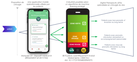 Autre atout, grâce à ces informations recueillies, le chirurgien, dans son analyse, va pouvoir optimiser sa stratégie de prise en charge en bénéficiant d’une plateforme complémentaire web dédiée. La solution web-praticien lui propose une vision de l’ensemble de ses patients ainsi que le détail des critères conditionnant le diagnostic d’évolution chez le patient. En postchirurgie, le patient continue de renseigner le modèle et ainsi améliorer la qualité des soins.