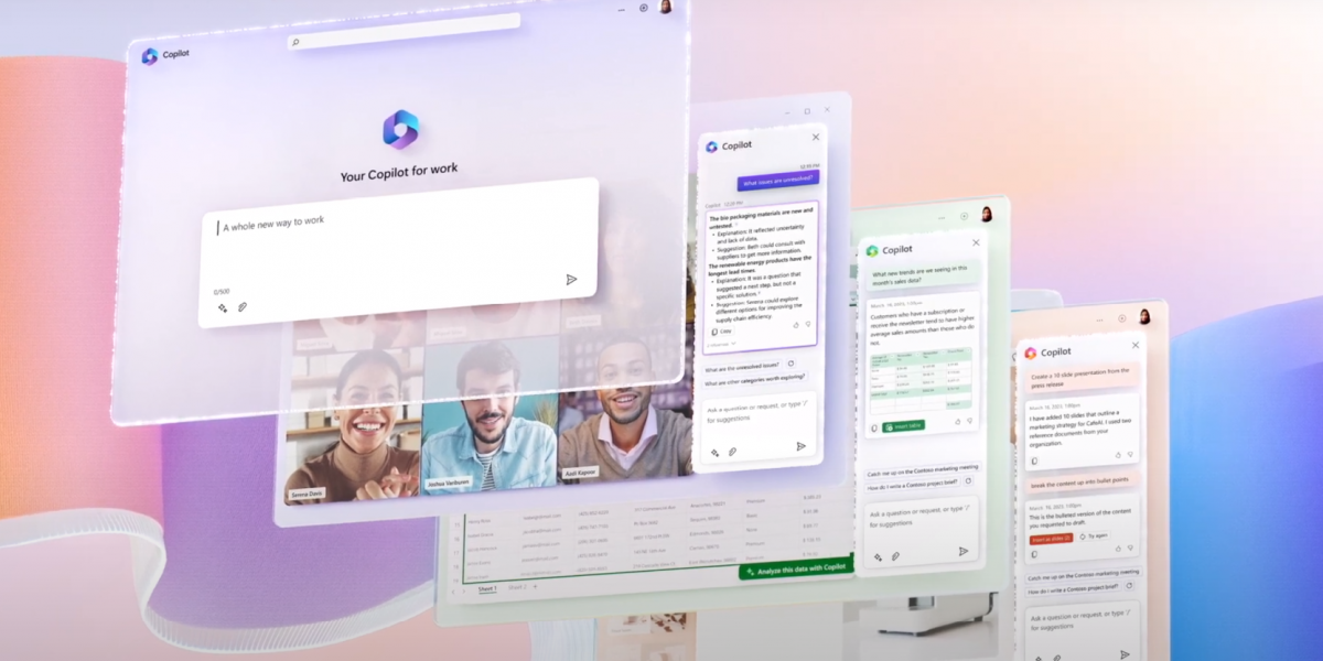 Microsoft a présenté en ligne ce 16 mars l'évènement « The Future of Work With AI ». Il a dévoilé son nouvel assistant IA de productivité « Microsoft 365 Copilot » qui combine la puissance des grands modèles de langage, notamment GPT-4, avec les données de Microsoft Graph (calendrier, e-mails, chats, documents, réunions) et les applications Microsoft 365. Il a également annoncé le lancement de la nouvelle fonctionnalité « Business Chat ».