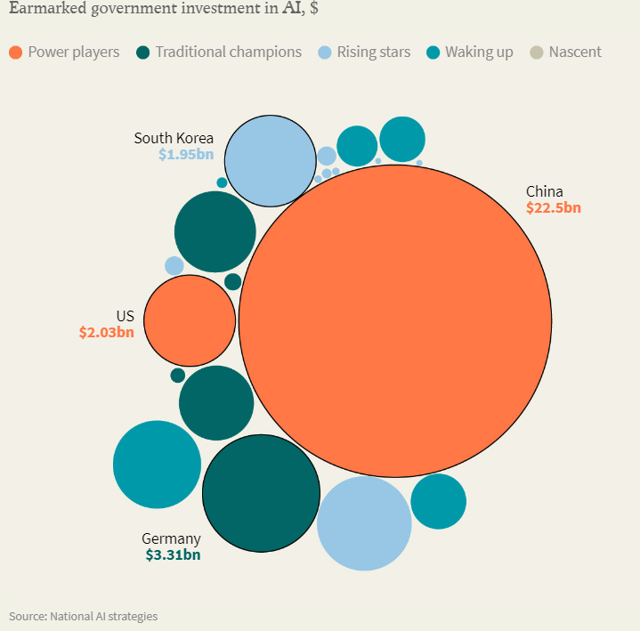 Chine, encore loin derrière pour le moment, est le pays qui progresse le plus vite, classé premier sur le plan de la stratégie gouvernementale (investissements...).