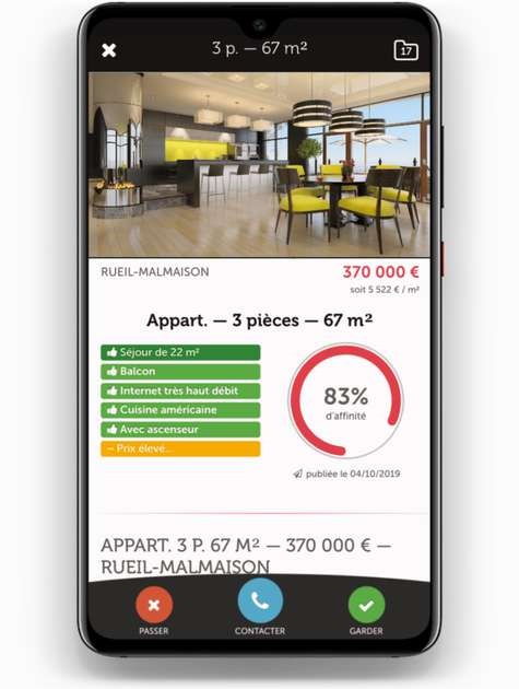 Durant tout la durée de sa recherche, l'utilisateur reçoit chaque nouvelle annonce pertinente, avec toutes les infos nécessaires pour pouvoir juger si le bien l'intéresse et un score de compatibilité avec le projet. Il choisira de cliquer sur « j'aime » ou « je n'aime pas » ce qui va permettre d'affiner les recherches.