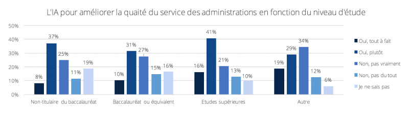 La perception de l’impact de l’IA sur les services publics suit la même logique. Seuls 43% des moins diplômés pensent que l’IA peut améliorer le fonctionnement de l’administration, contre 57% des plus diplômés.[caption id="attachment_9821" align="aligncenter" width="800"]