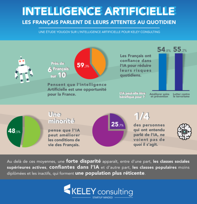 Le cabinet Keley Consulting et l’institut YouGov France ont réalisé une étude publiée en septembre dernier sur la perception des Français sur l'intelligence artificielle. Ils se sont intéressés à des questions fondamentales telles que si la population française pense que l’IA améliorera leurs conditions de vie, s'ils attendent un impact sur l’emploi, la santé ou encore la sécurité. Et de façon plus générale, quelle place occupera l’IA dans leur quotidien.