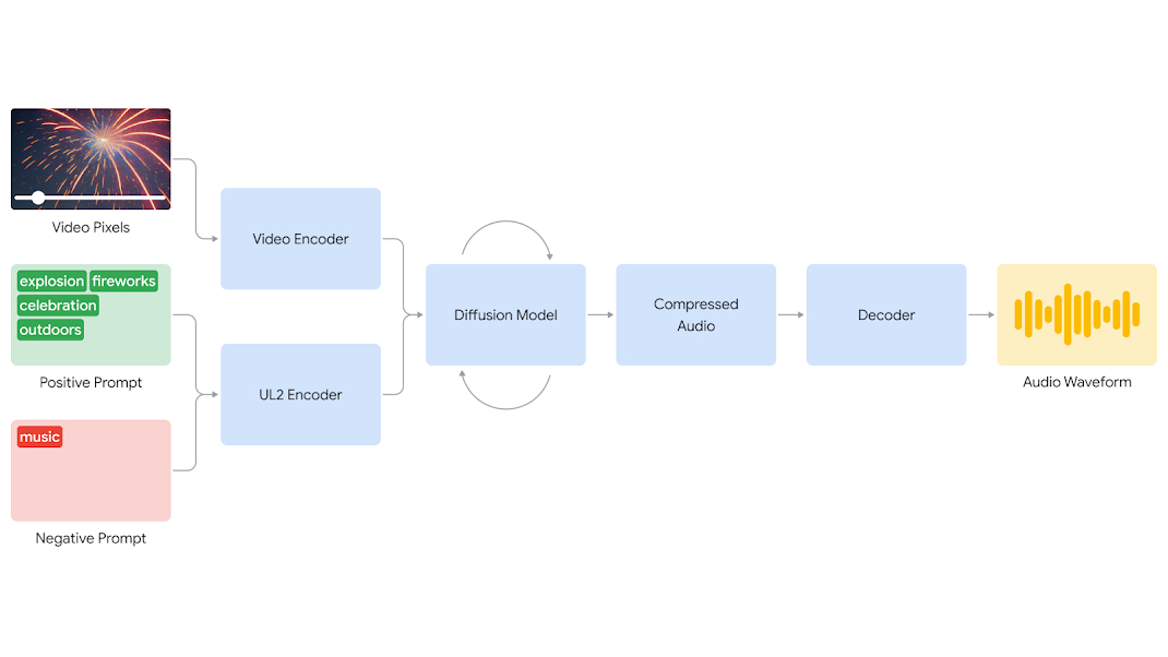 Le système V2A commence par encoder l'entrée vidéo dans une représentation compressée. Ensuite, un modèle de diffusion affine de manière itérative l'audio à partir de bruit aléatoire, guidé par les pixels vidéo et les invites textuelles. Finalement, l'audio généré est décodé en une forme d'onde et synchronisé avec la vidéo.[caption id="attachment_58587" align="alignnone" width="1070"]