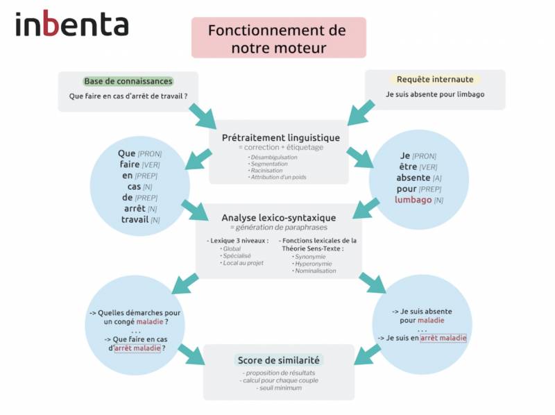 Pour cela, Inbenta développe une technologie d’analyse sémantique (du sens) qui interprète des conversations formulées en langage naturel par les utilisateurs. Basée sur l'application de la théorie linguistique Sens-Texte, celle-ci permet d'interpréter une question en langage humain et d'y apporter des réponses à partir d'une base de connaissances. Quelle que soit la manière dont l'utilisateur formule sa question, le taux de bonne réponse approche les 90%.