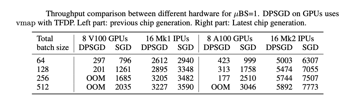 Tableau : Comparaison des performances avec des configurations différentes et une taille de microlot de 1. La descente DPSGD sur GPU s’appuie sur l’algorithme vmap et la bibliothèque de confidentialité différentielle TensorFlow. À gauche : puce de génération précédente. À droite : puce de dernière génération.[/caption]