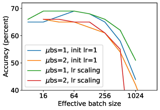Figure 1 : Précision de la classification après 100 époques d’apprentissage pour différents nombres d’accumulations de gradients. Un nanolot de taille 1 est comparé à un microlot de taille 2. La taille de lot effective correspond au total obtenu en multipliant la taille du microlot par le nombre d’accumulations de gradients. Des troncations et un bruit semblables ont été utilisés pour différentes tailles de lot effectives. Ainsi, les entrées associées à la même taille de lot effective sont garantes d’une protection identique de la confidentialité.[/caption]