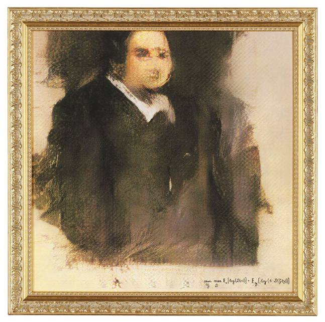 Le Portrait de Edmond Belamy a été réalisé par trois jeunes français, le collectif Obvious. Elle est signée par la formule d’un algorithme GAN en hommage à Ian Goodfellow son inventeur.