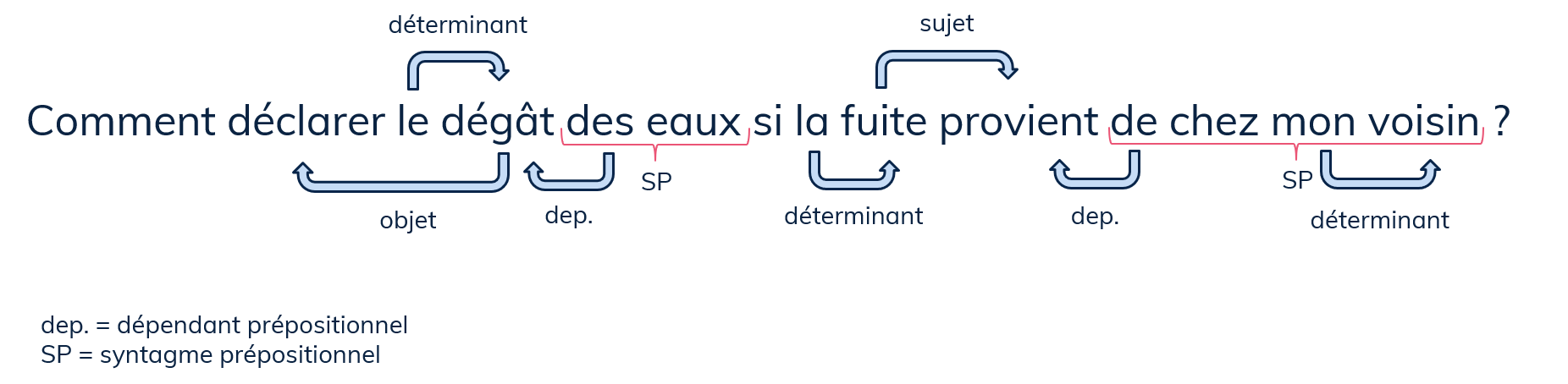 Par exemple, dans notre phrase exemple « Comment déclarer un dégât des eaux si la fuite provient de chez mon voisin ? », la présence de « eau » (ou « dégâts des eaux » pour les systèmes plus sophistiqués) permet de renforcer l’interprétation de « fuite » en « écoulement d’un liquide » au détriment d’un autre sens possible, à savoir « s’échapper ».