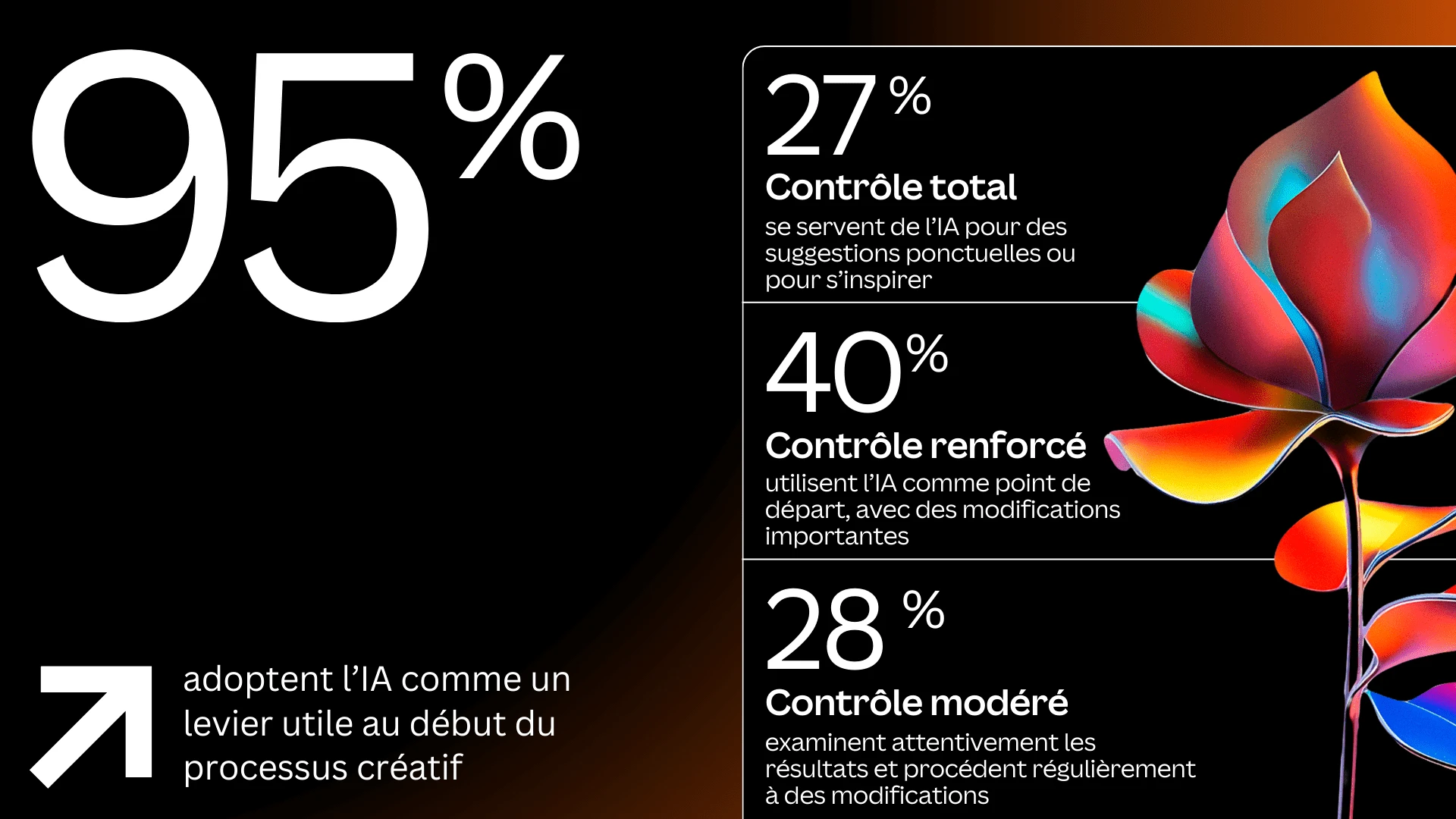 Operational efficiency stands out as one of the most tangible benefits of generative AI: 79% of French marketing specialists say it saves them at least four hours of work per week, while one in five respondents report a gain of more than ten hours weekly. Simultaneously, its impact on creativity is notable: 77% of respondents globally believe it enriches and accelerates team production (compared to 69% in 2023), without replacing humans.