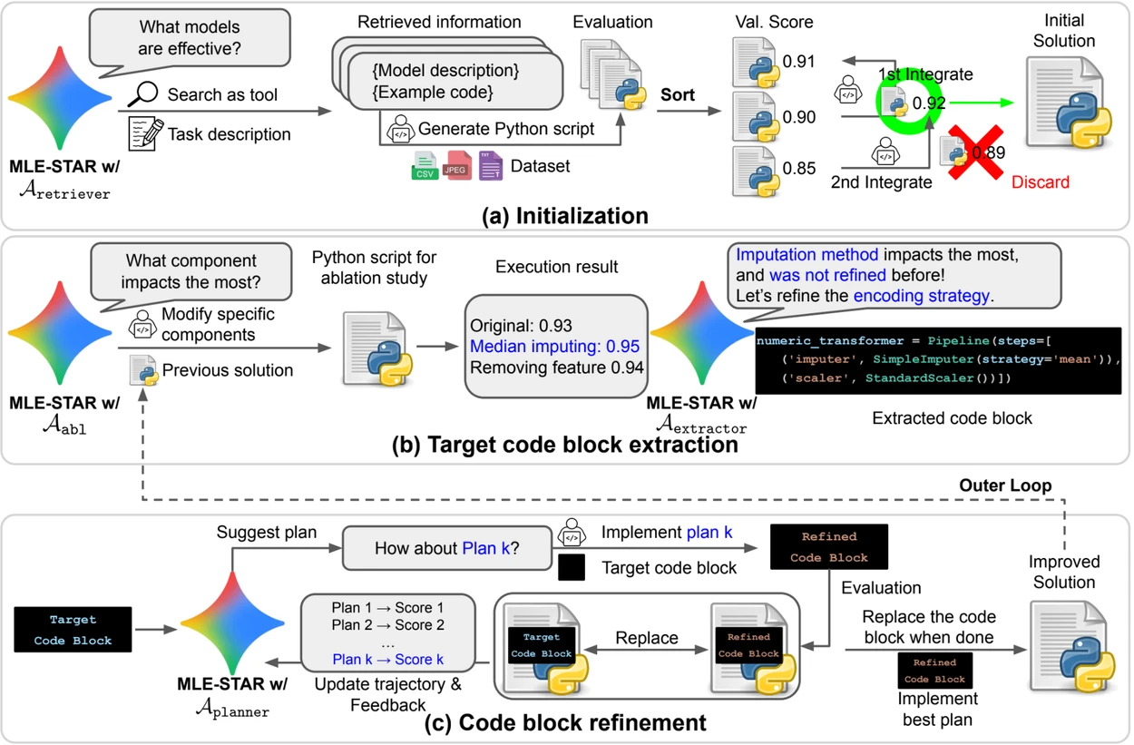 This iterative process, search, critical block identification, optimization, then new iteration, allows MLE-STAR to focus its efforts where they produce the most measurable gains.