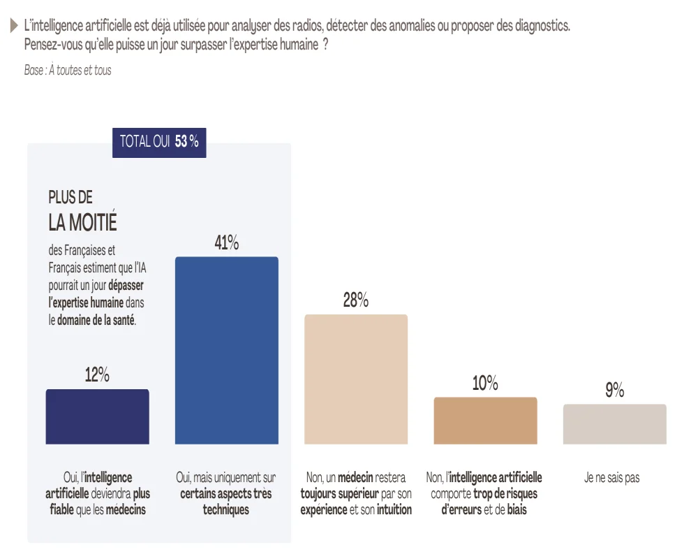 When asked about AI's ability to surpass human skills, a relative majority adopts a nuanced stance. Only 12% believe it could become more reliable than doctors throughout the entire care pathway. However, more than one in two (53%) acknowledges that it could surpass professionals in certain targeted, primarily technical areas, such as medical image analysis or early detection of weak signals.